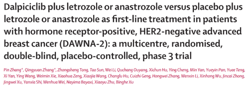5月12日,达尔西利联合来曲唑或阿那曲唑一线治疗HR+/HER2-晚期乳腺癌的Ⅲ期DAWNA-2研究期中分析结果全文在线发表于国际肿瘤学领域顶级期刊《柳叶刀·肿瘤学》(The Lancet Oncology,影响因子:54.433)[1]。中国医学科学院肿瘤医院徐兵河院士牵头开展该研究。